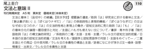 2003年6月刊行予定でしたが、12年の時を経てようやく刊行されるとのこと。東京言語研究所 春季講座に登壇した尾上圭介先生の「日本語意味論」のハンドアウトに「近刊」と記載されてました。